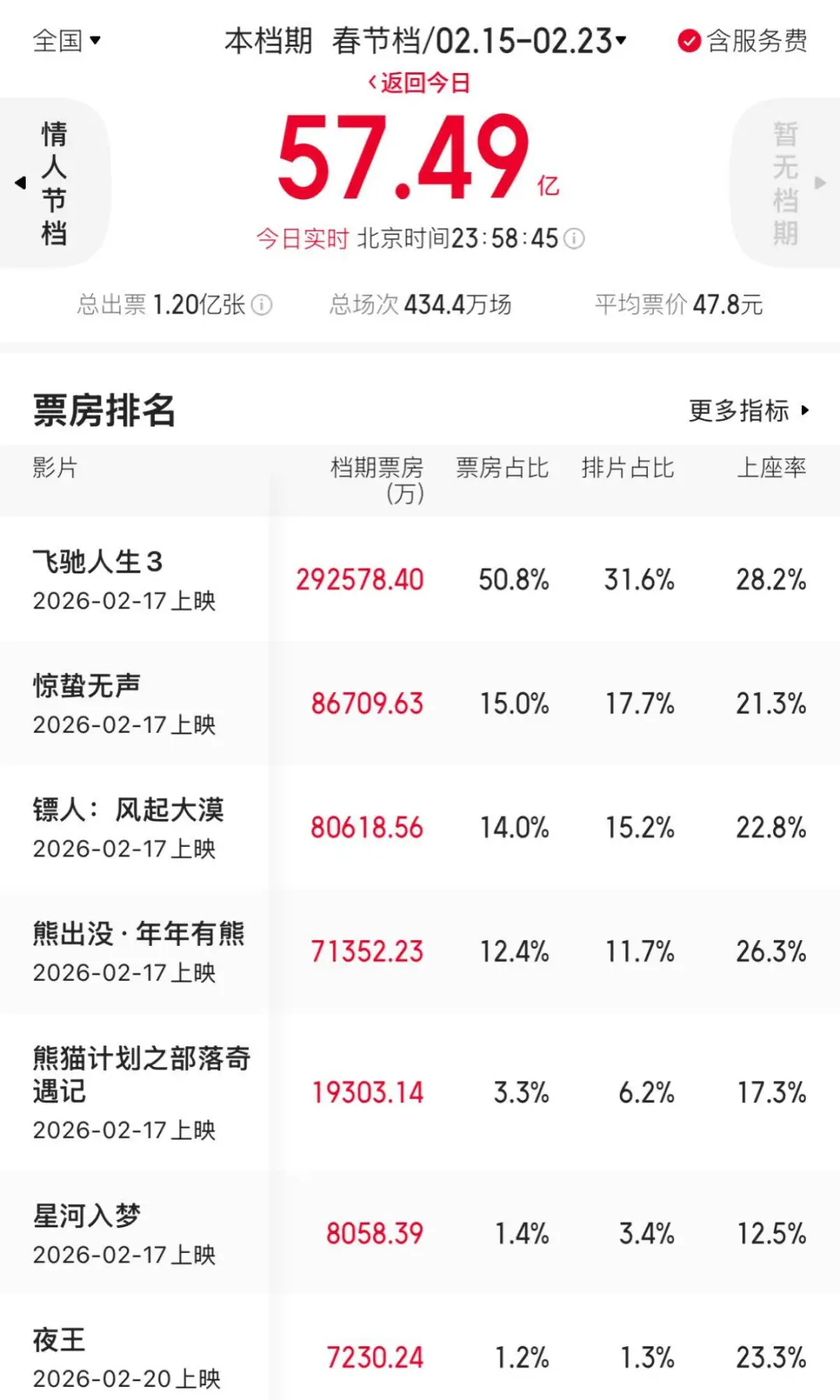 2月23日晚,长达9天的2026春节档以57.49亿票房圆满收官,从上映第一天就强势领跑的《飞驰人生3》毫无悬念地成为档期票房冠军,票房占比更是高达50.8%,拿下了春节档的“半壁江山”;《惊蛰无声》《镖人》分列亚军和季军。