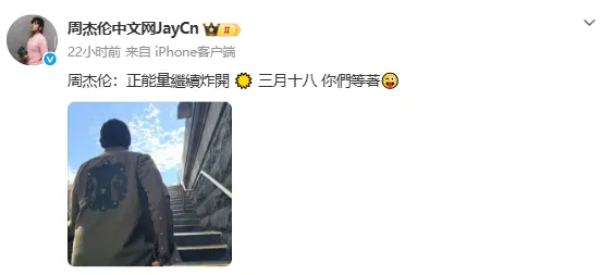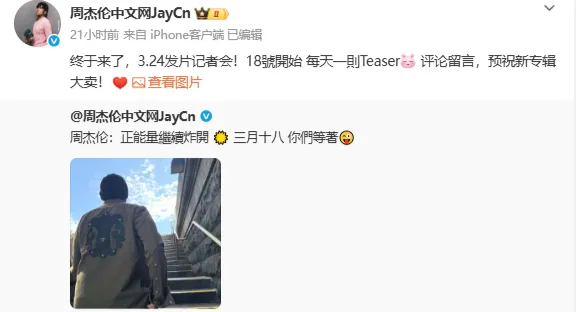 3月10日晚,周杰伦更新个人社媒账号,官宣从3月18日开始,每天将更新一则短片并宣布3月24日举行新专辑发片记者会。