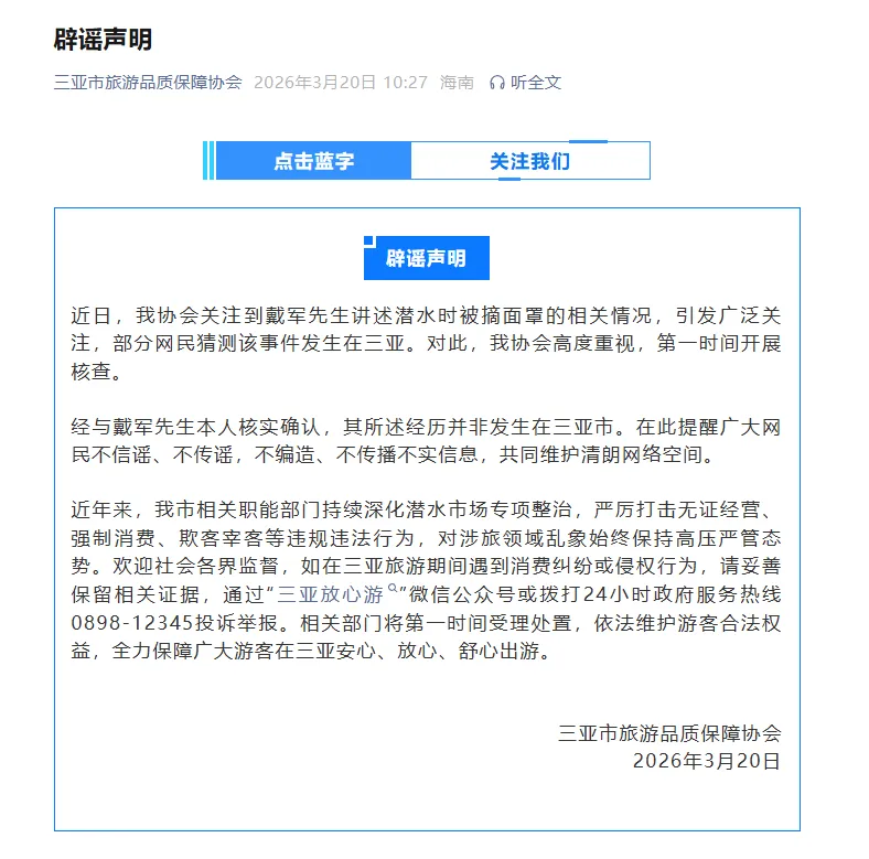 3月20日,三亚市旅游品质保障协会发辟谣声明:
