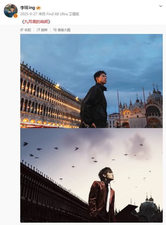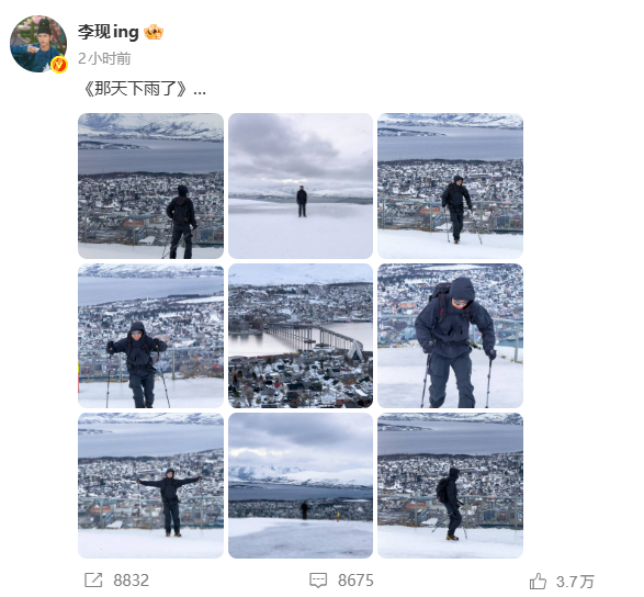 3月25日,演员李现在个人社交账号分享雪地徒步照片,并配文引用周杰伦新歌《那天下雨了》,为其打call,氛围感满满。