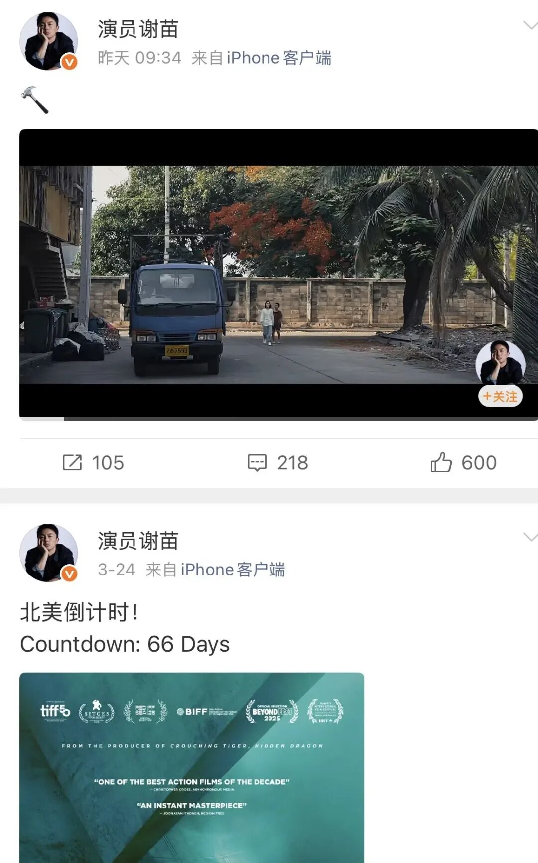这几年,谢苗凭借《东北警察故事》系列等电影圈粉无数,被视为“能为华语动作电影扛旗的人”。吴京此前在直播中透露,他在“摇人”拍《镖人》时也邀请了谢苗,还开玩笑说自己是看着“苗哥”的电影长大的,“他那么小(拍电影)的时候,我还没入行”。