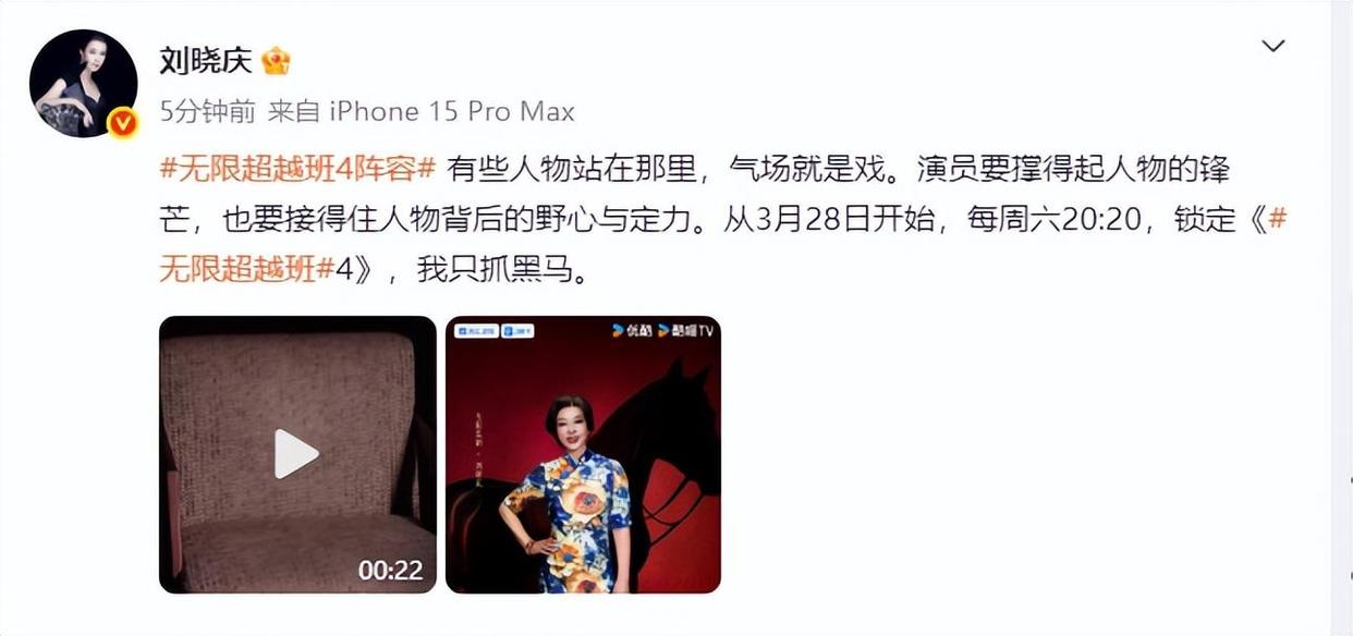 3月27日,@刘晓庆 官宣加入无限超越班4:有些人物站在那里,气场就是戏。演员要撑得起人物的锋芒,也要接得住人物背后的野心与定力。