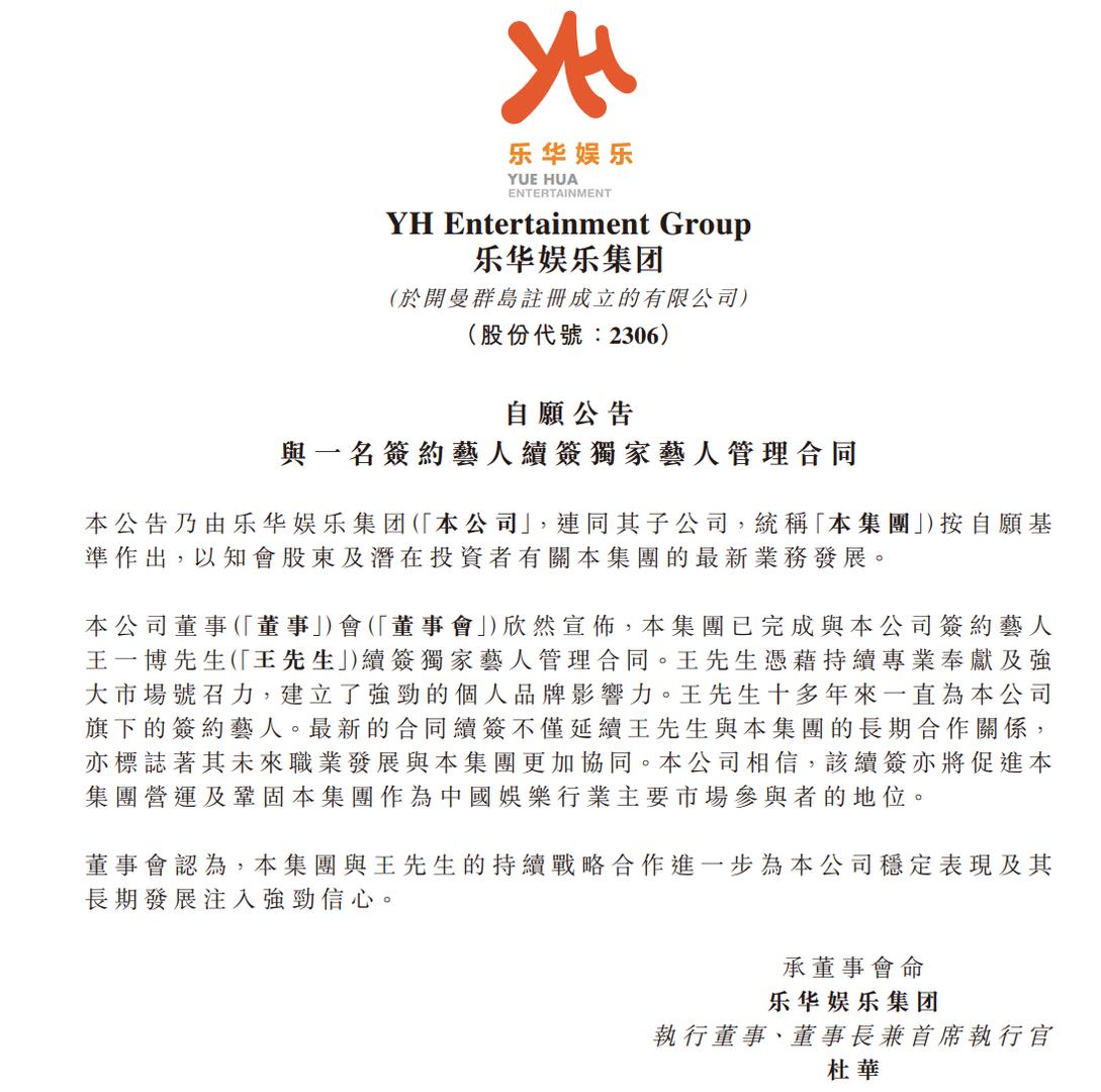 3月27日,乐华娱乐(02306.HK)公告,公司董事会欣然宣布,集团(乐华娱乐与其子公司统称“集团”)已完成与公司签约艺人王一博续签独家艺人管理合同。