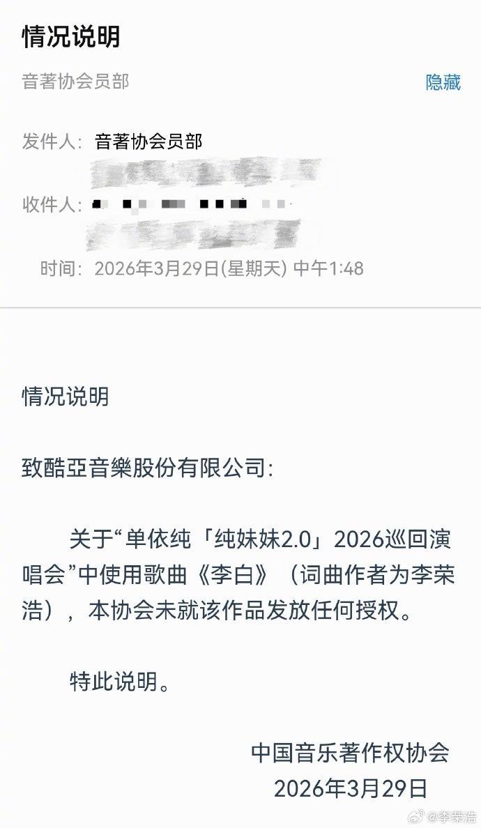 在单依纯道歉后,李荣浩再发文质问,并晒出音著协确认邮件。其表示:“中国著作权协会今日发来的确认邮件,我公司没有授权,没有可授权第三方,请问你用什么立场、什么权利、什么角度、什么心态演唱?”