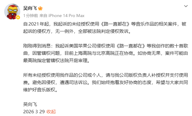 29日下午,歌手吴向飞连发两条微博质问李荣浩,“最近我发现李荣浩曾公开演唱我写的《路一直都在》,没向我取得授权,也没有向我支付任何使用费。李荣浩是不是也应该向我道个歉?”“所有未经授权使用我作品的公司或个人,请与我公司版权负责人补授权并支付使用费。”