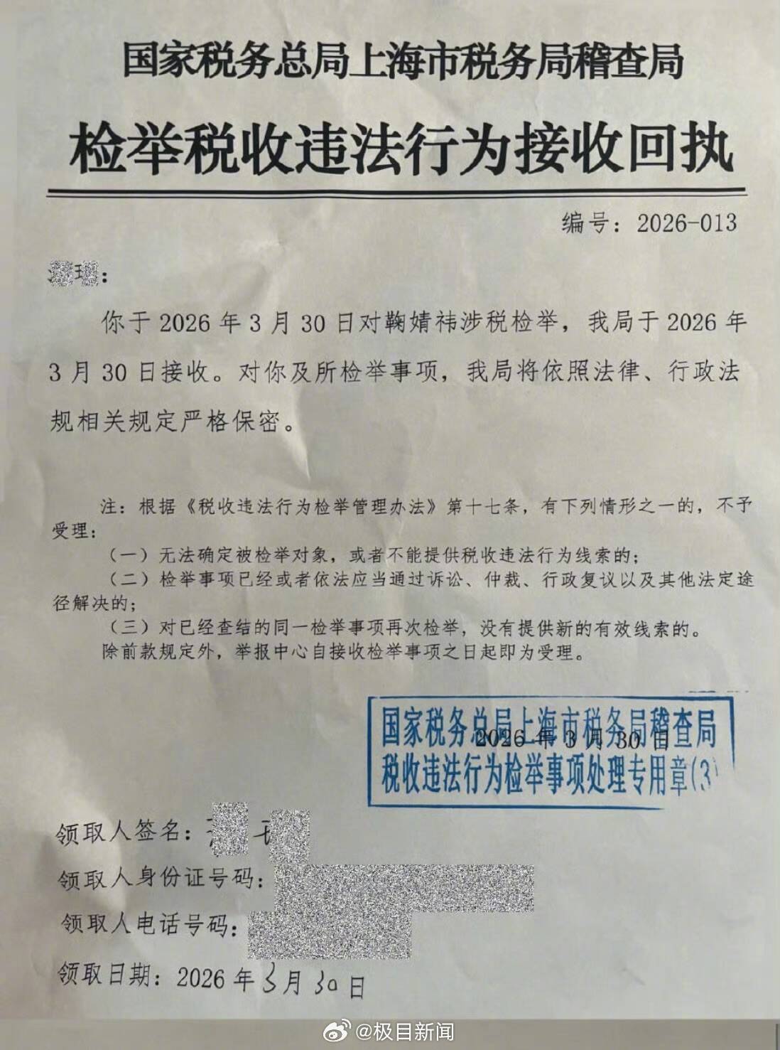 3月31日上午,三张实名检举税收违法行为的函件在社交平台登陆热搜。函件显示,有人在3月30日于国家税务总局上海市税务局稽查局实名举报艺人鞠婧祎。极目新闻记者注意到,30日当天,鞠婧祎与郭敬明合作的新剧《月鳞绮纪》曾传出将于31日定档、4月1日空降上线的消息。