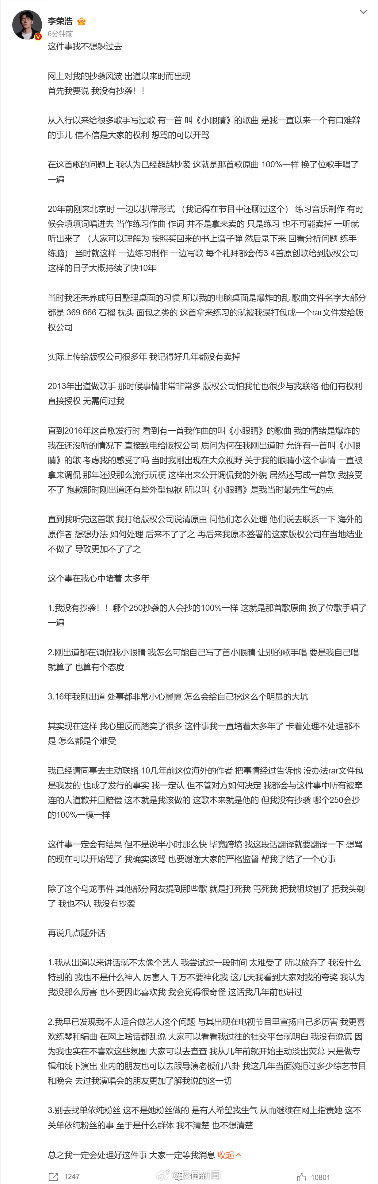 4月1日,针对近期网络热议的抄袭争议,歌手李荣浩于近日发布长文公开回应,明确否认抄袭指控,详细解释《小眼睛》歌曲争议系早年误发练习作品的乌龙事件,并表示将主动联系海外原作者致歉赔偿,同时澄清其他相关争议、呼吁停止网暴相关人员。