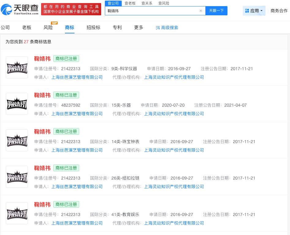 天眼查App显示,丝芭传媒旗下上海丝芭演艺管理有限公司已申请多枚“鞠婧祎”商标,国际分类涉及科学仪器、珠宝钟表等,商标状态均为已注册。