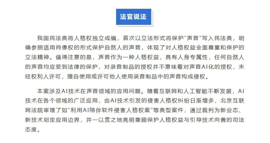2024年4月23日,北京互联网法院一审开庭宣判全国首例AI生成声音人格权侵权案,明确认定在具备可识别性的前提下,自然人声音权益的保护范围可及于AI生成声音。