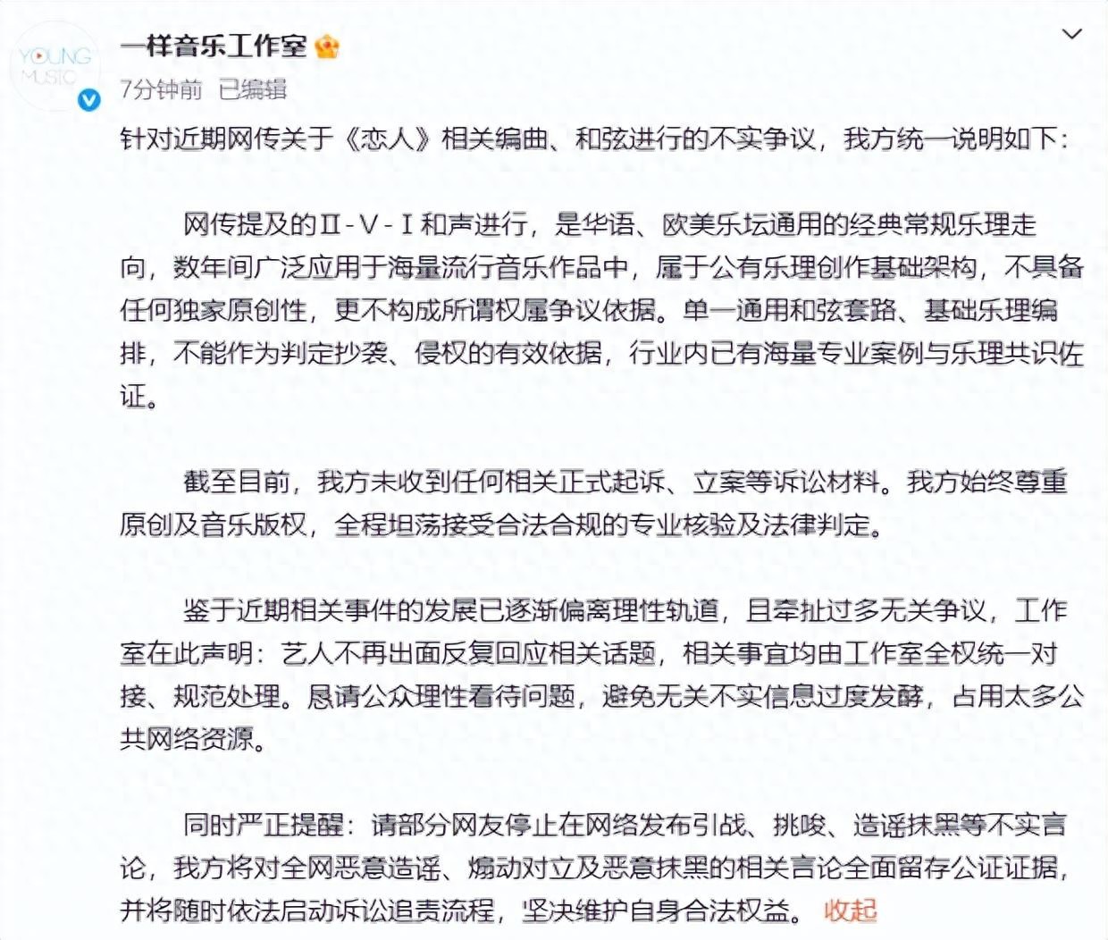 针对近期网传关于《恋人》相关编曲、和弦进行的不实争议,我方统一说明如下:网传提及的Ⅱ-Ⅴ-Ⅰ和声进行,是华语、欧美乐坛通用的经典常规乐理走向,数年间广泛应用于海量流行音乐作品中,属于公有乐理创作基础架构,不具备任何独家原创性,更不构成所谓权属争议依据。单一通用和弦套路、基础乐理编排,不能作为判定抄袭、侵权的有效依据,行业内已有海量专业案例与乐理共识佐证。截至目前,我方未收到任何相关正式起诉、立案等诉讼材料。我方始终尊重原创及音乐版权,全程坦荡接受合法合规的专业核验及法律判定。鉴于近期相关事件的发展已逐渐偏离理性轨道,且牵扯过多无关争议,工作室在此声明:艺人不再出面反复回应相关话题,相关事宜均由工作室全权统一对接、规范处理。恳请公众理性看待问题,避免无关不实信息过度发酵,占用太多公共网络资源。同时严正提醒:请部分网友停止在网络发布引战、挑唆、造谣抹黑等不实言论,我方将对全网恶意造谣、煽动对立及恶意抹黑的相关言论全面留存公证证据,并将随时依法启动诉讼追责流程,坚决维护自身合法权益。