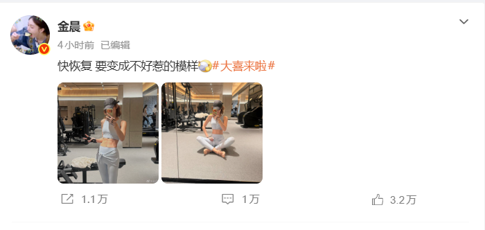 今天,女演员金晨在社交平台上晒出腹肌照,并配文:“快恢复,要变成不好惹的模样。”