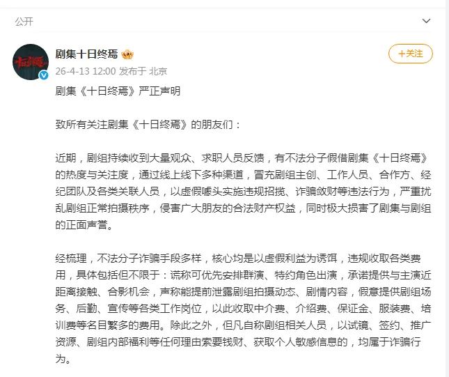 近期,剧组持续收到大量观众、求职人员反馈,有不法分子假借剧集《十日终焉》的热度与关注度,通过线上线下多种渠道,冒充剧组主创、工作人员、合作方、经纪团队及各类关联人员,以虚假噱头实施违规招揽、诈骗敛财等违法行为,严重扰乱剧组正常拍摄秩序,侵害广大朋友的合法财产权益,同时极大损害了剧集与剧组的正面声誉。