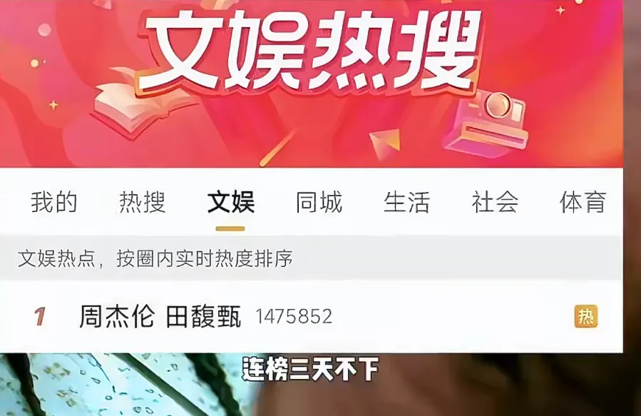 此前,有关“周杰伦田馥甄 旧情证据”的话题冲上热搜第一,并且一直连续霸榜三天,话题阅读量单日甚至超过了10亿。