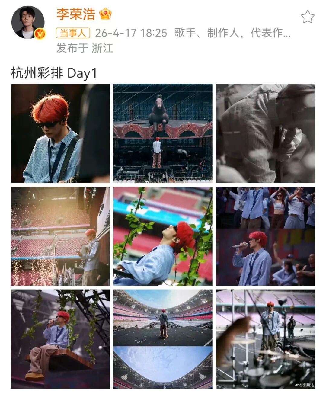 此前4月17日傍晚,李荣浩在个人社交平台晒出多张杭州彩排照。