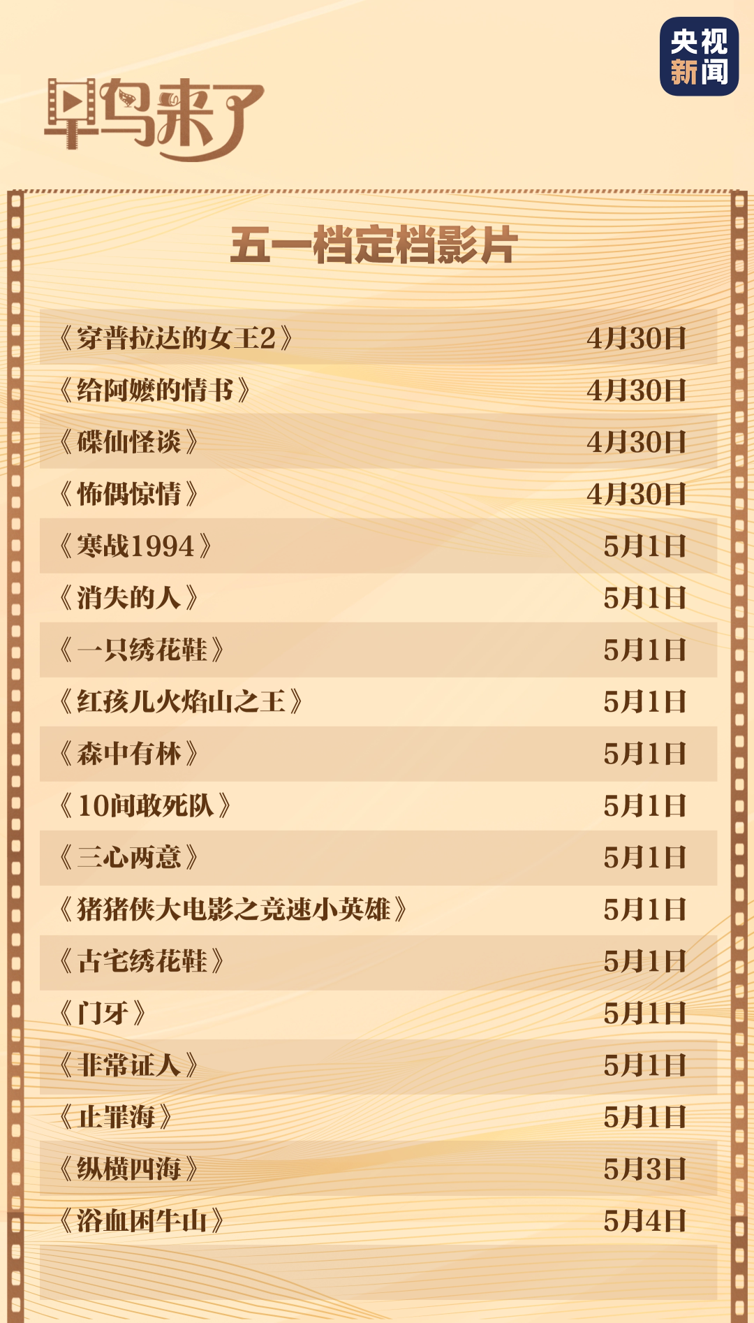 今年五一假期,电影市场迎来多部新作,影片阵容持续加码。截至目前已有《浴血困牛山》《寒战1994》《10间敢死队》《森中有林》《猪猪侠大电影之竞速小英雄》《门牙》等18部影片定档五一,涵盖动作、喜剧、悬疑、动画、历史战争等多元题材,类型丰富、看点十足,满足不同观众观影喜好,一起先睹为快!
