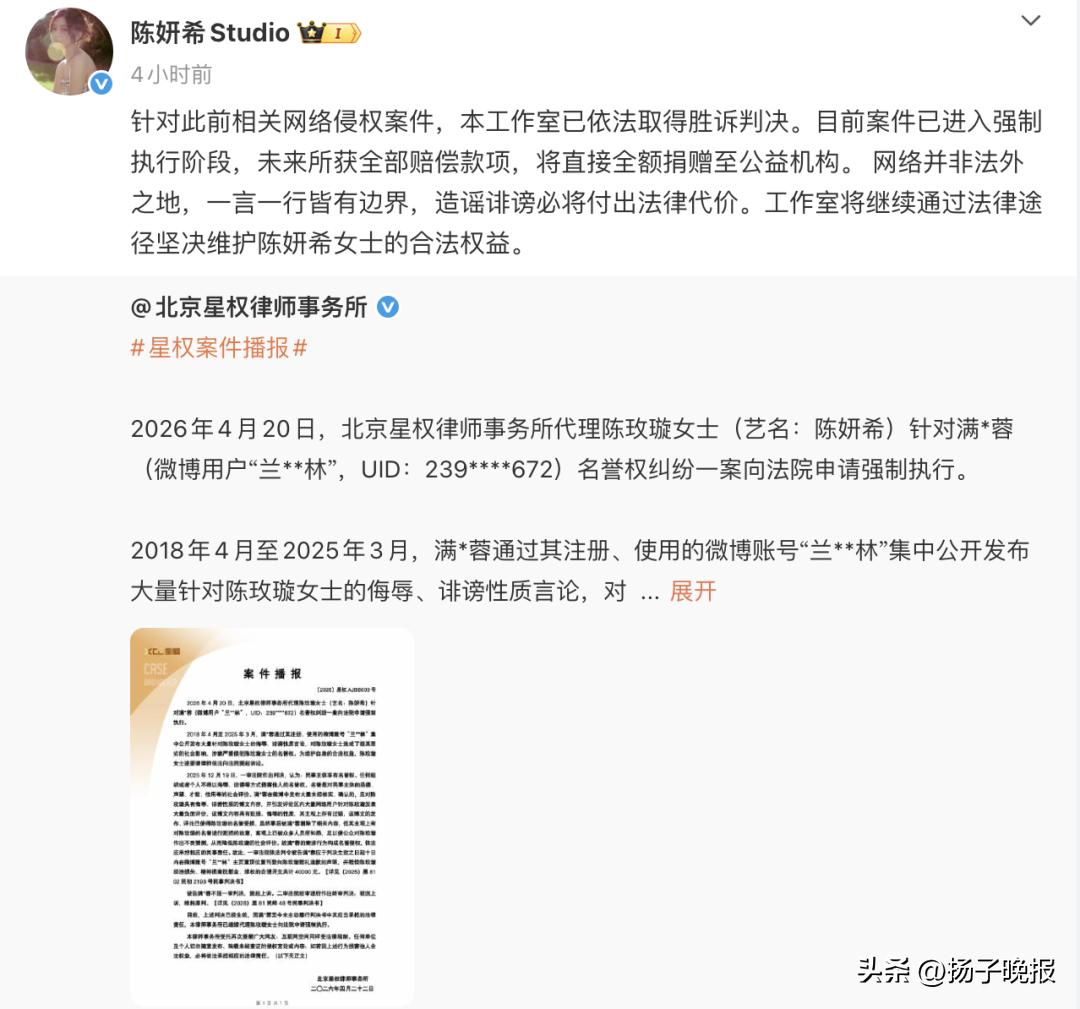 针对此前相关网络侵权案件,本工作室已依法取得胜诉判决。目前案件已进入强制执行阶段,未来所获全部赔偿款项,将直接全额捐赠至公益机构。 网络并非法外之地,一言一行皆有边界,造谣诽谤必将付出法律代价。工作室将继续通过法律途径坚决维护陈妍希女士的合法权益。