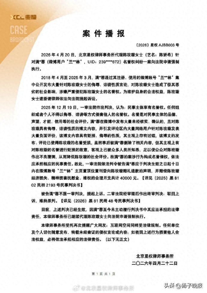 4月22日,北京星权律师事务所公开代理陈玫璇(艺名:陈妍希)维权案件民事判决书,被告满某被判在个人账号主页置顶位置刊登向陈玫璇赔礼道歉的声明,并赔偿陈玫璇经济损失、精神损害抚慰金、维权的合理开支共计4万元。