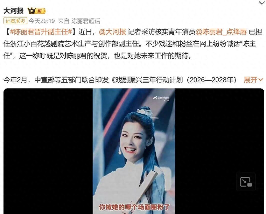 近日,记者采访核实青年演员陈丽君已担任浙江小百花越剧院艺术生产与创作部副主任。不少戏迷和粉丝在网上纷纷喊话“陈主任”,这一称呼既是对陈丽君的祝贺,也是对她未来工作的期待。