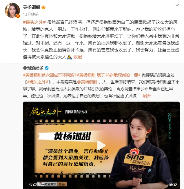 4月27日,黄杨钿甜转发风波后的首次专访,并配文:“虽然谣言已经澄清,但还是很抱歉因为自己的原因掀起了这么大的风波,给我的家人、朋友、工作伙伴、网友们都带来了影响,也让我的粉丝们担心了,在此认真地和大家道歉,很抱歉给大家添麻烦了,让你们卷入其中我真的非常难过,对不起。还有,这一年来,所有的批评我都收到了,谢谢大家愿意督促我成长,我会认真改正错误弥补不足,所有的善意我也收到了,我会努力,让自己变成值得被大家信任的大人。”!