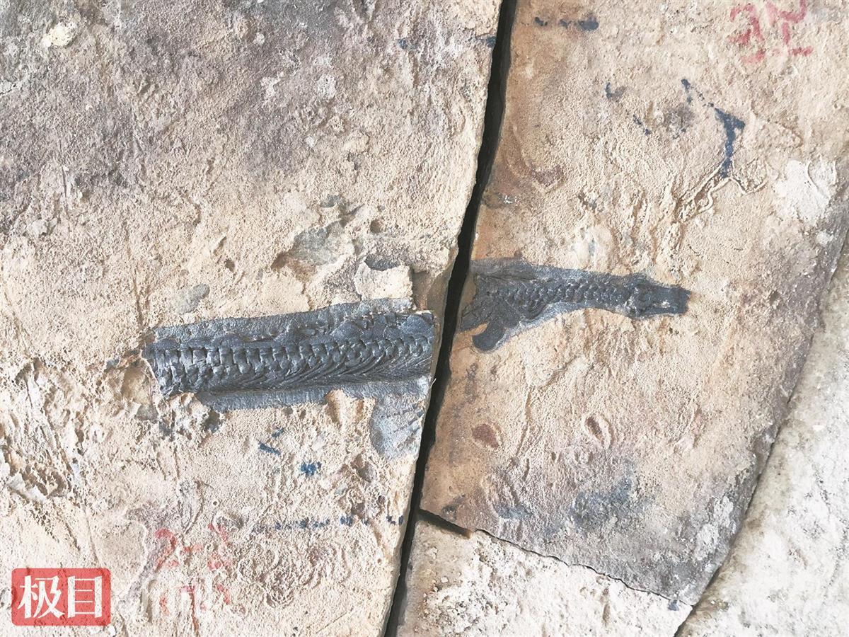 3月8日,极目新闻记者在保护屋里看到,陈列的几块石板上,清晰可见化石的印刻花纹,跟真骨骼无异。屋内的科普图上介绍,这些是湖北鳄、扇桨龙等远古海生爬行动物的化石,是国际科学界非常推崇的史前生命。