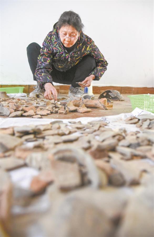The 65-year-old Zhang Congcui, retired for over 10 years, has been working with her fellows at Zoumaling Site for nearly two months, with a mission to find out of the more than 1,000 pottery shards as many as possible adjacent pieces for their connection and adhesion into a complete object.