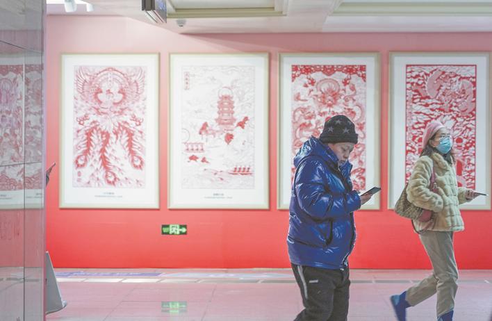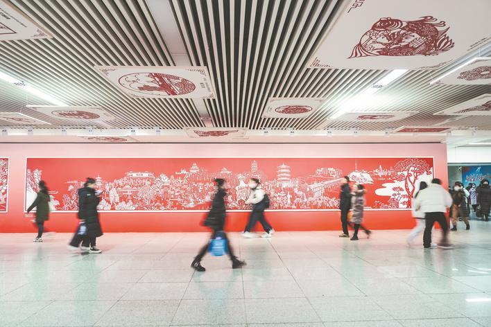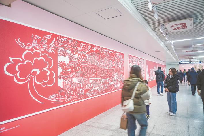 Photo taken onJan.21 shows apaper-cutting art exhibition in celebration of the upcoming Chinese zodiac Year of the Dragon at a metro station in Wuhan, capital city of Hubei Province. (Photo: Chutian Metropolis Daily / Wang Yongsheng)