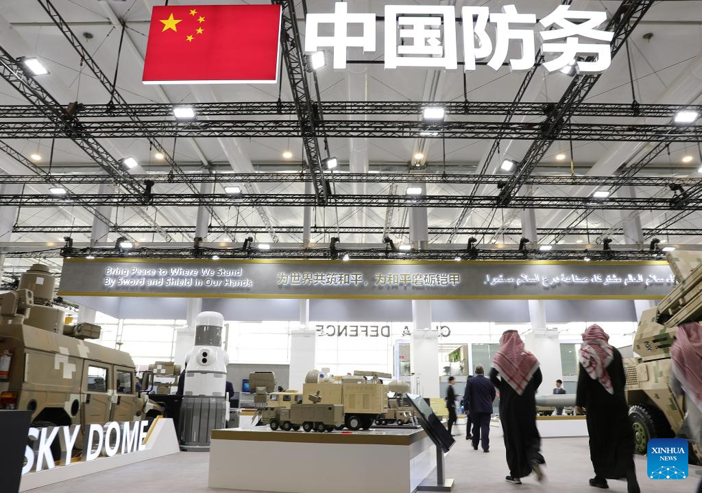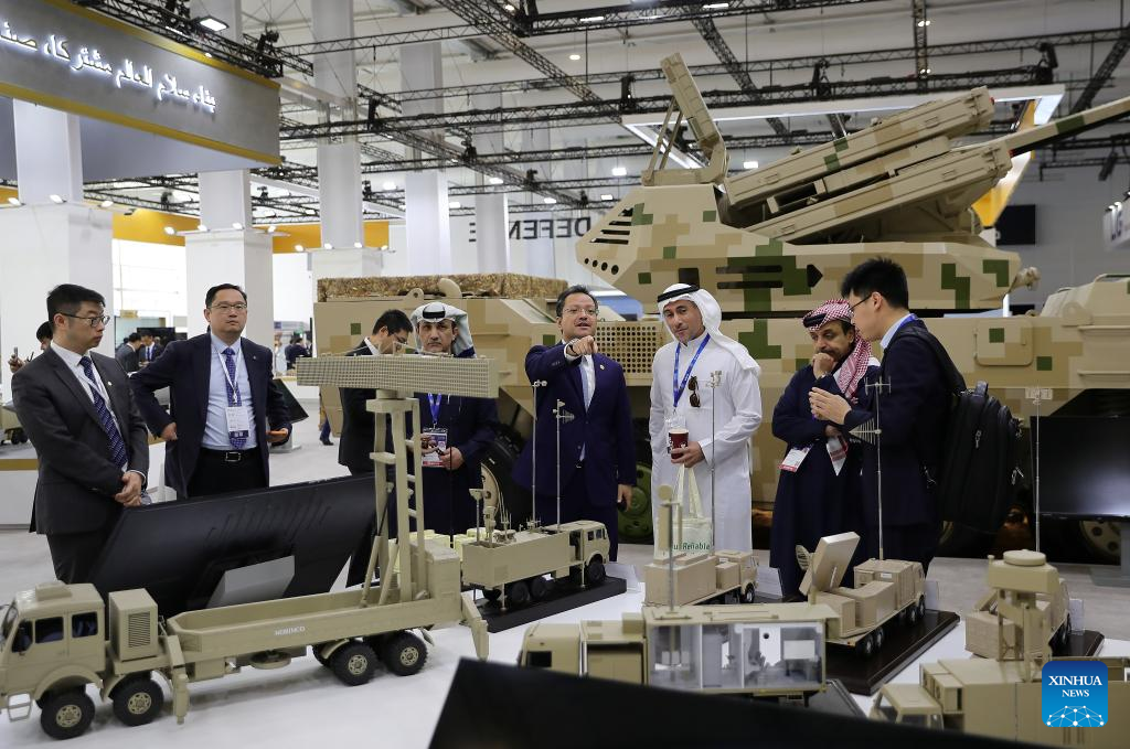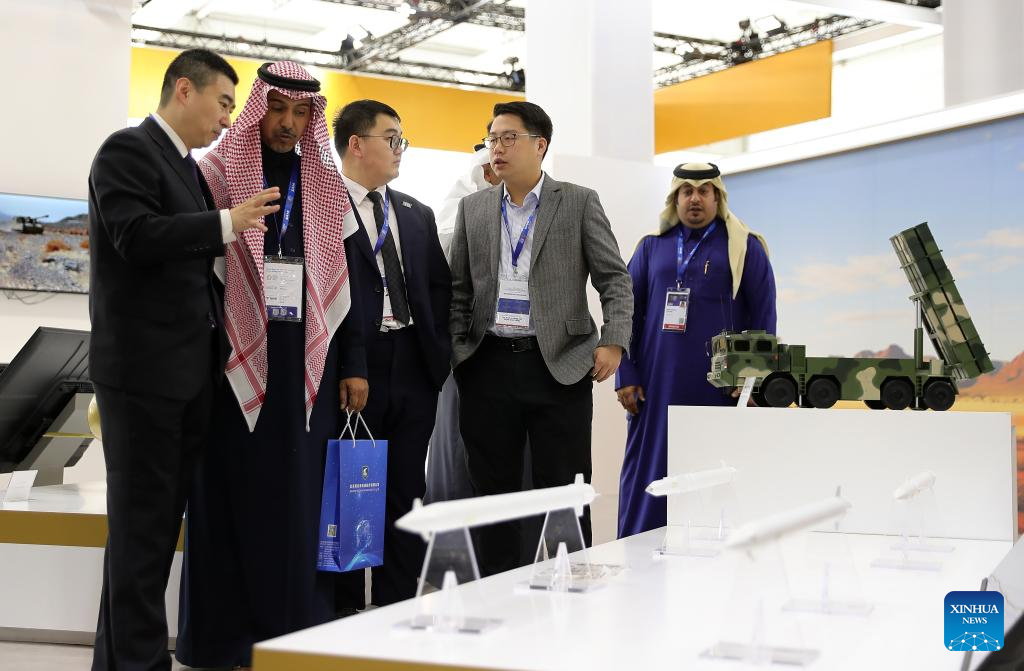 People visit the China Defense exhibition area during the second edition of the World Defense Show in Riyadh, Saudi Arabia, Feb. 5, 2024. Saudi Arabia kicked off Sunday the second edition of the World Defense Show in the capital Riyadh, with Chinese defense delegation and Chinese Air Force attending. (Xinhua/Wang Dongzhen)