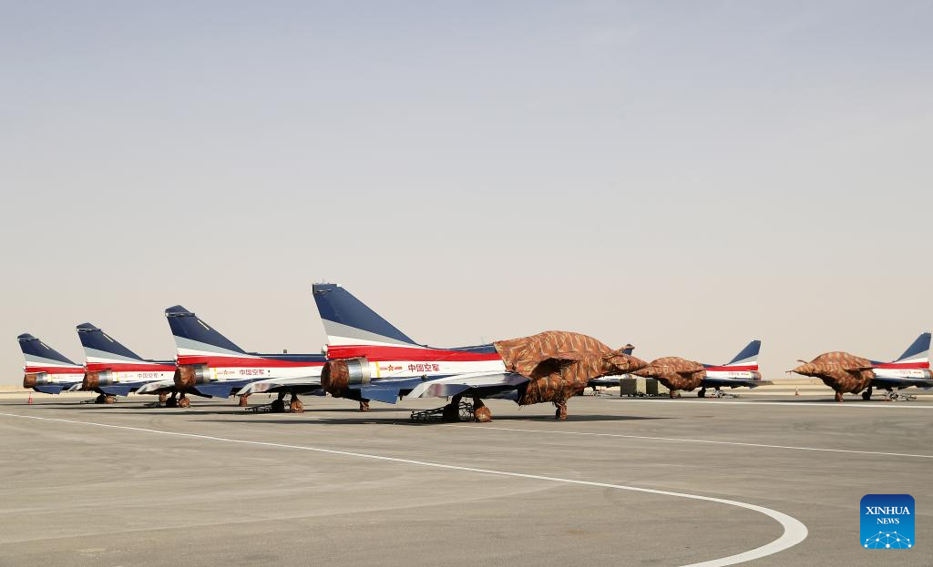 Aircrafts of the August 1st aerobatic demonstration team of the Chinese Air Force are seen at the second edition of the World Defense Show in Riyadh, Saudi Arabia, Feb. 4, 2024. Saudi Arabia kicked off Sunday the second edition of the World Defense Show in the capital Riyadh, with Chinese defense delegation and Chinese Air Force attending. (Xinhua/Wang Dongzhen)