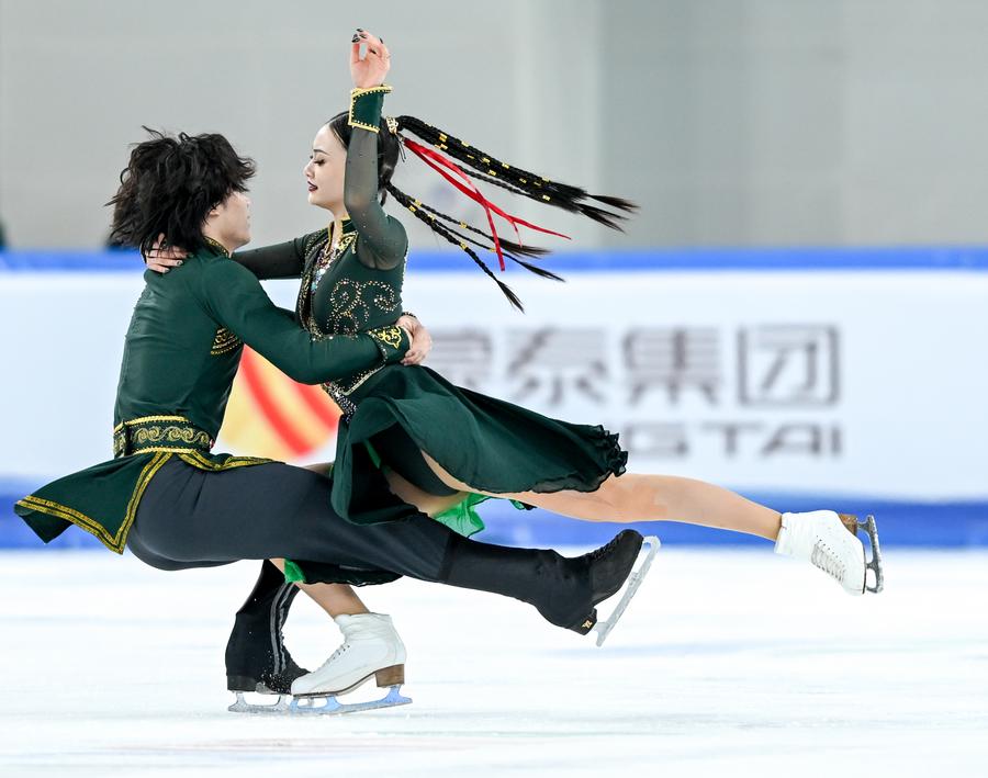 Li Xuantong(R)/Wang Xinkang of team Beijing perform during the ice dance free dance of junior group at the China's 14th National Winter Games in Hulun Buir, north China's Inner Mongolia Autonomous Region, Jan. 19, 2024. (Xinhua/Lian Zhen)