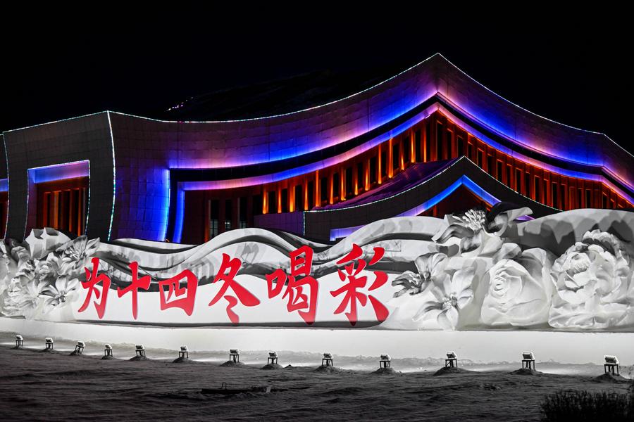 This photo taken on Feb. 14, 2024 shows a snow sulpture outside of the main halls of the China's 14th National Winter Games in Hulunbuir, north China's Inner Mongolia Autonomous Region. (Xinhua/Lian Zhen)