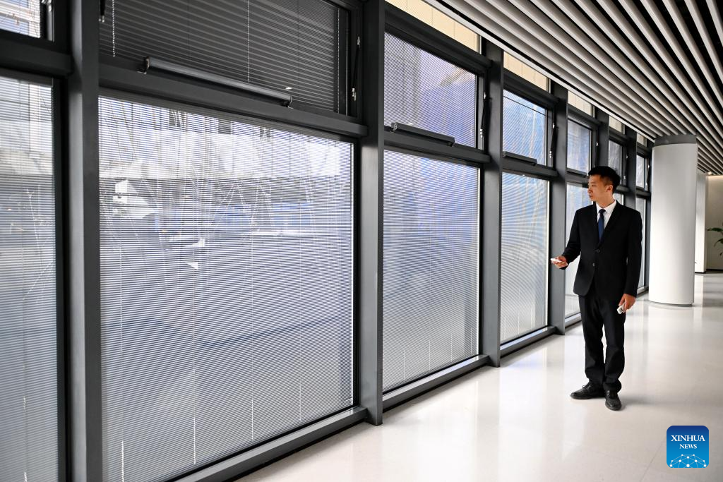 A staff member shows the coated glass with thermal insulation and shading effects at the Xiong'an pilot free trade zone communication and exhibition center in Xiong'an New Area, north China's Hebei Province, March 28, 2024. In April 2017, China announced a plan to establish the Xiong'an New Area, which spans the Rongcheng, Anxin and Xiongxian counties, as well as some adjacent areas in north China's Hebei Province.