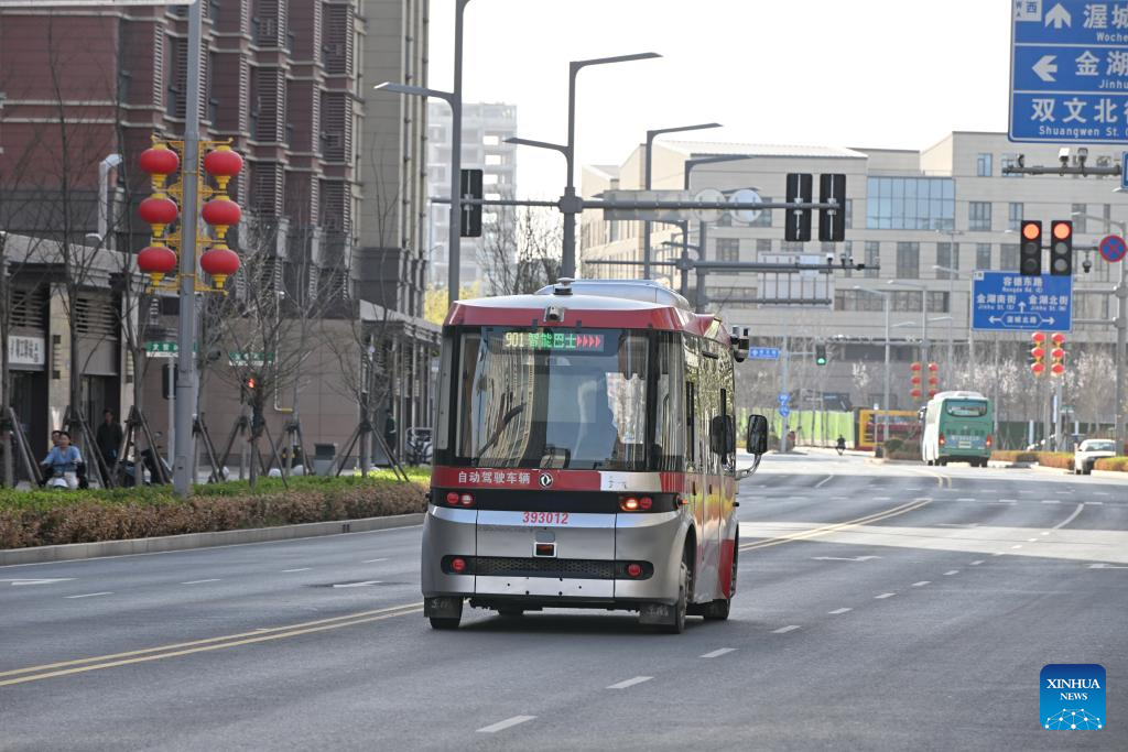 An intelligent connected bus runs on a road in Rongdong area of Xiong'an New Area, north China's Hebei Province, March 29, 2024. In April 2017, China announced a plan to establish the Xiong'an New Area, which spans the Rongcheng, Anxin and Xiongxian counties, as well as some adjacent areas in north China's Hebei Province.