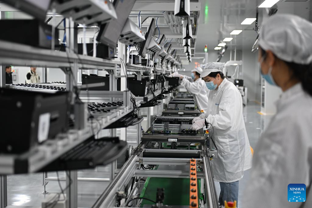 Workers work on the production lines at a test base in the Xiong'an Science and Technology Innovation Center in Xiong'an New Area, north China's Hebei Province, March 28, 2024. In April 2017, China announced a plan to establish the Xiong'an New Area, which spans the Rongcheng, Anxin and Xiongxian counties, as well as some adjacent areas in north China's Hebei Province.