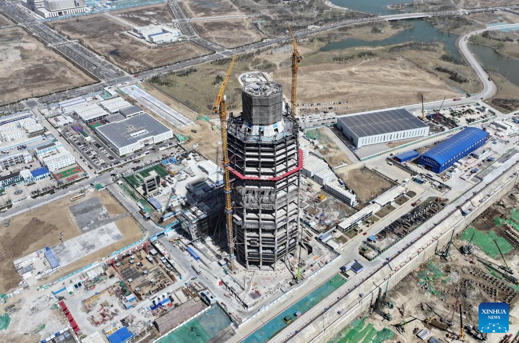 An aerial drone photo taken on March 28, 2024 shows the construction site of the headquarters of China Satellite Network Group in Xiong'an New Area, north China's Hebei Province. In April 2017, China announced a plan to establish the Xiong'an New Area, which spans the Rongcheng, Anxin and Xiongxian counties, as well as some adjacent areas in north China's Hebei Province.