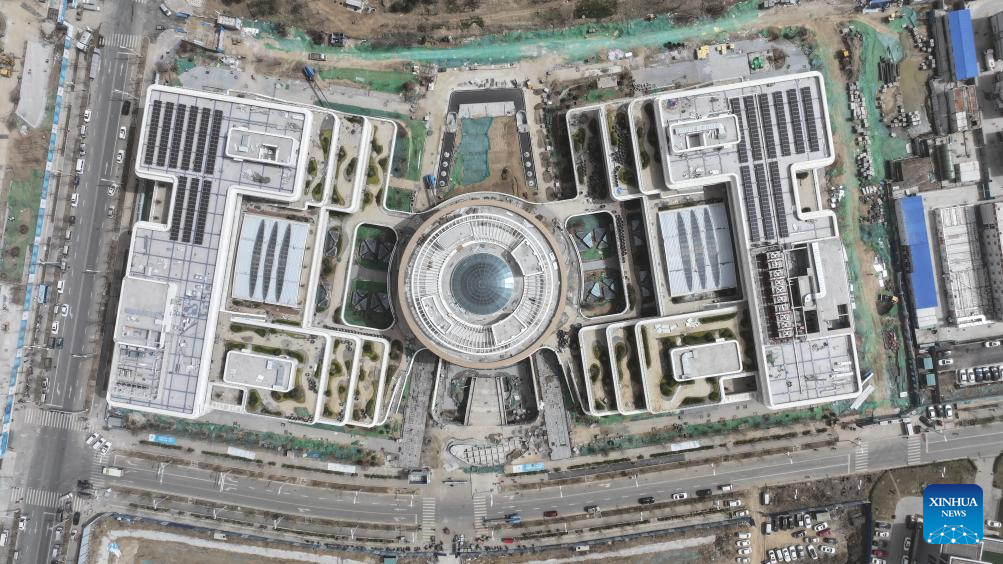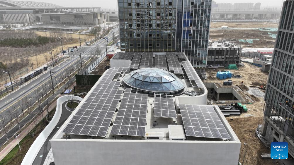 An aerial drone photo taken on March 28, 2024 shows the photovoltaic power generation facility on the roof of the Xiong'an pilot free trade zone communication and exhibition center in Xiong'an New Area, north China's Hebei Province. In April 2017, China announced a plan to establish the Xiong'an New Area, which spans the Rongcheng, Anxin and Xiongxian counties, as well as some adjacent areas in north China's Hebei Province.