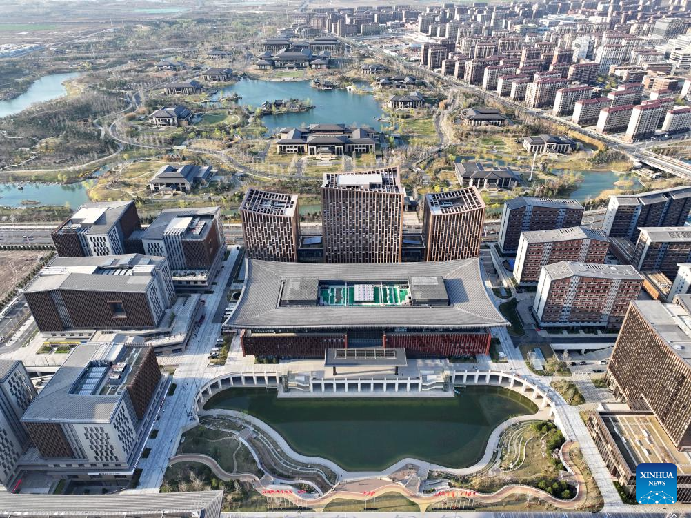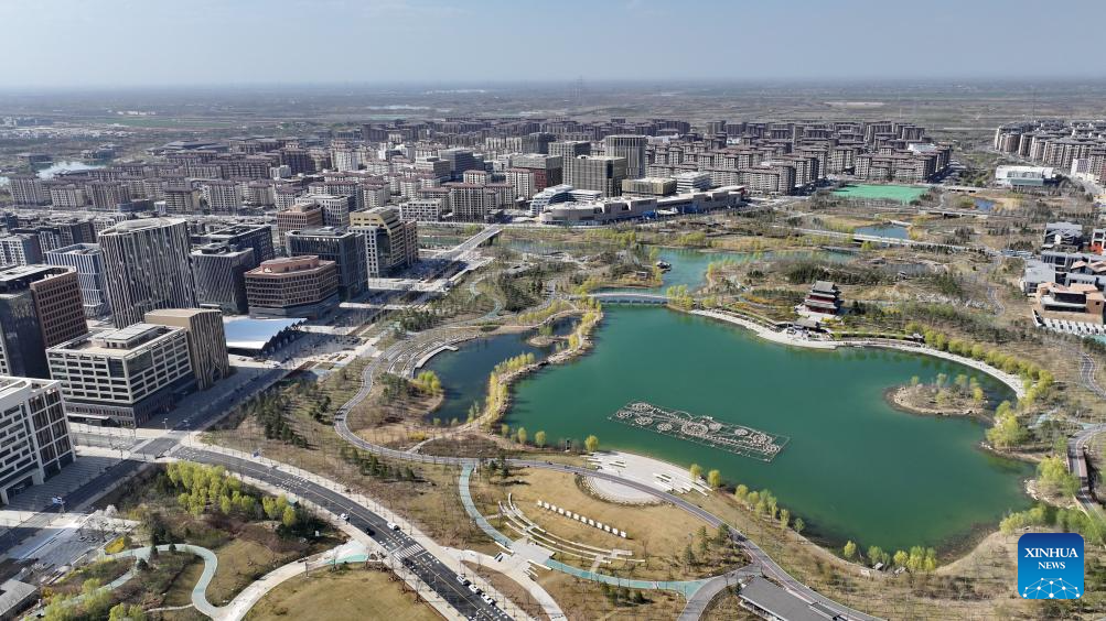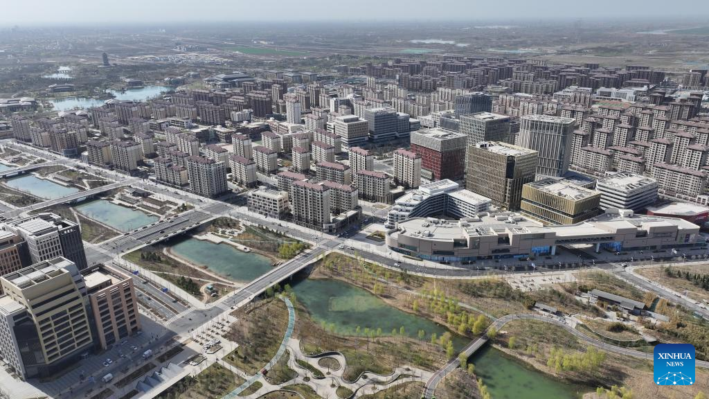 An aerial drone photo taken on March 30, 2024 shows the business service center in Xiong'an New Area, north China's Hebei Province. In April 2017, China announced a plan to establish the Xiong'an New Area, which spans the Rongcheng, Anxin and Xiongxian counties, as well as some adjacent areas in north China's Hebei Province.