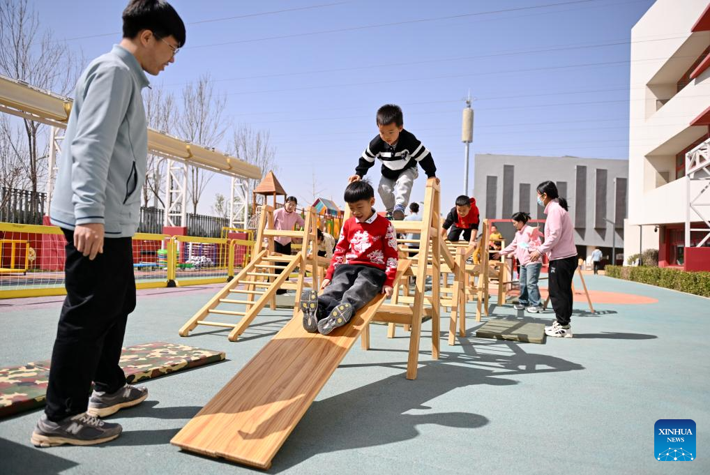 Children play at a kindergarten in Xiong'an New Area, north China's Hebei Province, March 29, 2024. In April 2017, China announced a plan to establish the Xiong'an New Area, which spans the Rongcheng, Anxin and Xiongxian counties, as well as some adjacent areas in north China's Hebei Province.