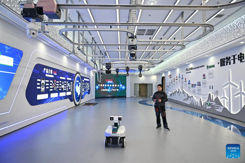 A staff member displays an inspection robot at a test base in the Xiong'an Science and Technology Innovation Center in Xiong'an New Area, north China's Hebei Province, March 28, 2024. In April 2017, China announced a plan to establish the Xiong'an New Area, which spans the Rongcheng, Anxin and Xiongxian counties, as well as some adjacent areas in north China's Hebei Province.
