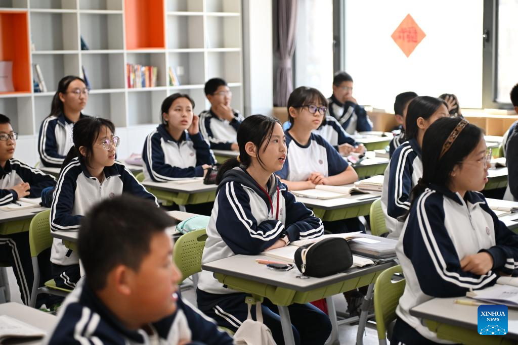 Students have class at a branch of Beijing No. 4 High School in Xiong'an New Area, north China's Hebei Province, March 29, 2024. In April 2017, China announced a plan to establish the Xiong'an New Area, which spans the Rongcheng, Anxin and Xiongxian counties, as well as some adjacent areas in north China's Hebei Province.