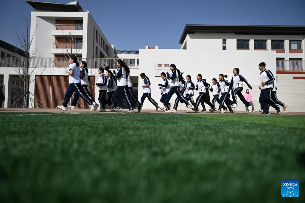Students have PE class at a branch of Beijing No. 4 High School in Xiong'an New Area, north China's Hebei Province, March 29, 2024. In April 2017, China announced a plan to establish the Xiong'an New Area, which spans the Rongcheng, Anxin and Xiongxian counties, as well as some adjacent areas in north China's Hebei Province.