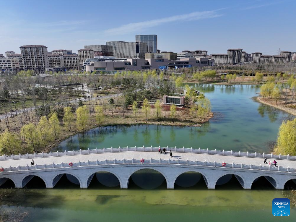 An aerial drone photo taken on March 29, 2024 shows a view of the Jinhu park in Xiong'an New Area, north China's Hebei Province. In April 2017, China announced a plan to establish the Xiong'an New Area, which spans the Rongcheng, Anxin and Xiongxian counties, as well as some adjacent areas in north China's Hebei Province.