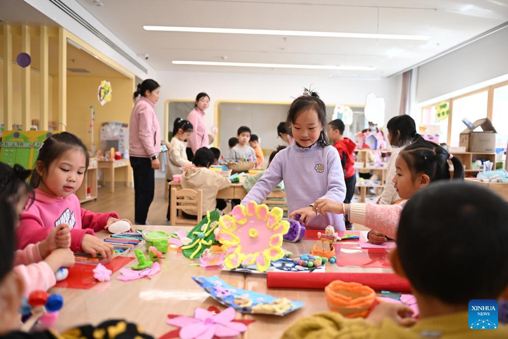 Children have a class at a kindergarten in Xiong'an New Area, north China's Hebei Province, March 29, 2024. In April 2017, China announced a plan to establish the Xiong'an New Area, which spans the Rongcheng, Anxin and Xiongxian counties, as well as some adjacent areas in north China's Hebei Province.