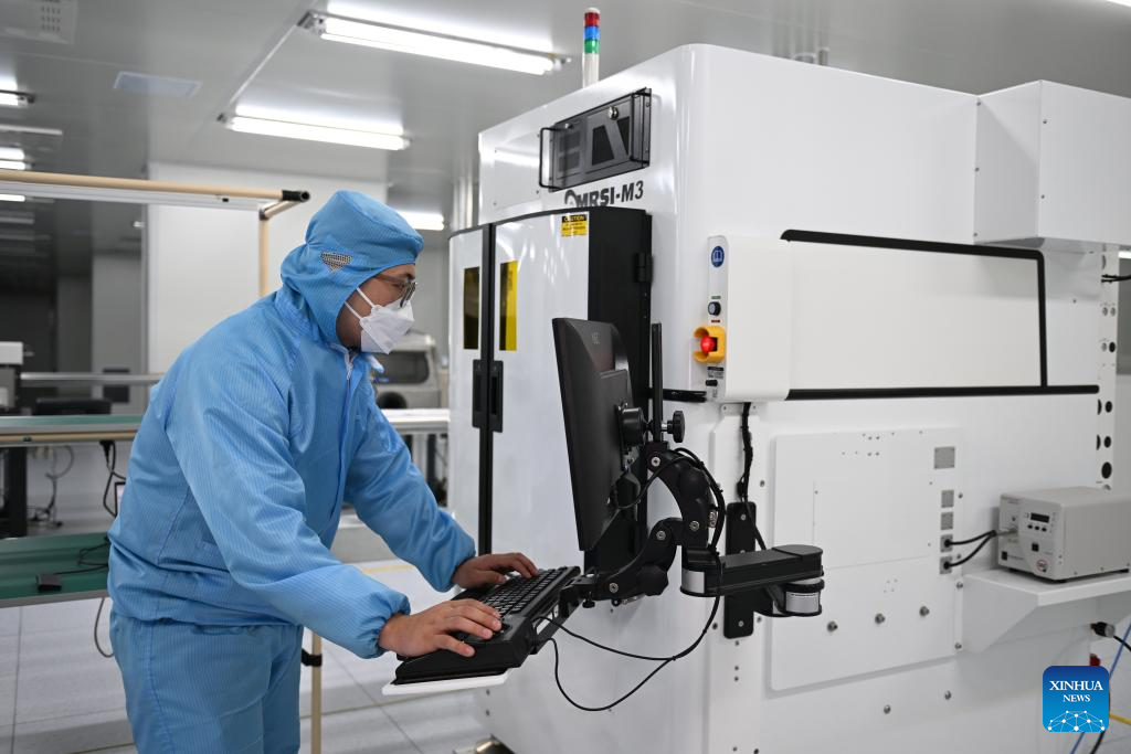 A staff member adjusts the chip production equipment at a test base in the Xiong'an Science and Technology Innovation Center in Xiong'an New Area, north China's Hebei Province, March 28, 2024. In April 2017, China announced a plan to establish the Xiong'an New Area, which spans the Rongcheng, Anxin and Xiongxian counties, as well as some adjacent areas in north China's Hebei Province.