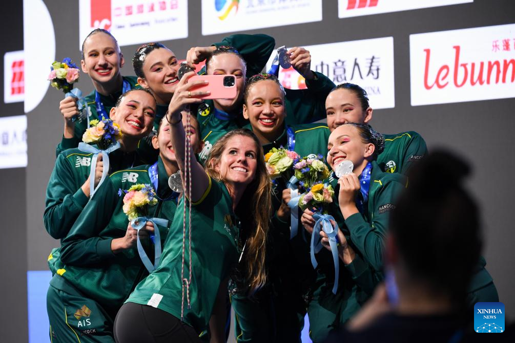 Silver medalists team Australia celebrate during the awarding ceremony for the team technical event at the World Aquatics Artistic Swimming World Cup 2024 in Beijing, capital of China, April 5, 2024. (Xinhua/Ju Huanzong)