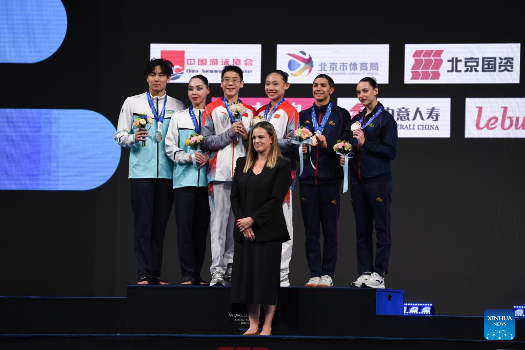 Gold medalists China's Ji Heyue(top 3rd R)/Guo Muye(top 3rd L), silver medalists Kazakhstan's Nargiza Bolatova(2nd L)/Kim Eduard(1st L) and bronze medalists Spain's Emma Garcia(1st R)/Jordi Caceres Iglesias (2nd R) pose during the awarding ceremony for the mixed duet technical event at the World Aquatics Artistic Swimming World Cup 2024 in Beijing, capital of China, April 5, 2024. (Xinhua/Ju Huanzong)