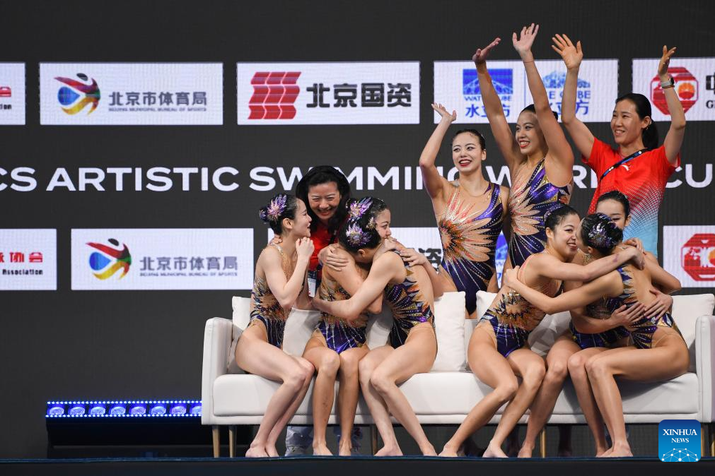 Team China celebrate after winning the team technical event at the World Aquatics Artistic Swimming World Cup 2024 in Beijing, capital of China, April 5, 2024. (Xinhua/Ju Huanzong)