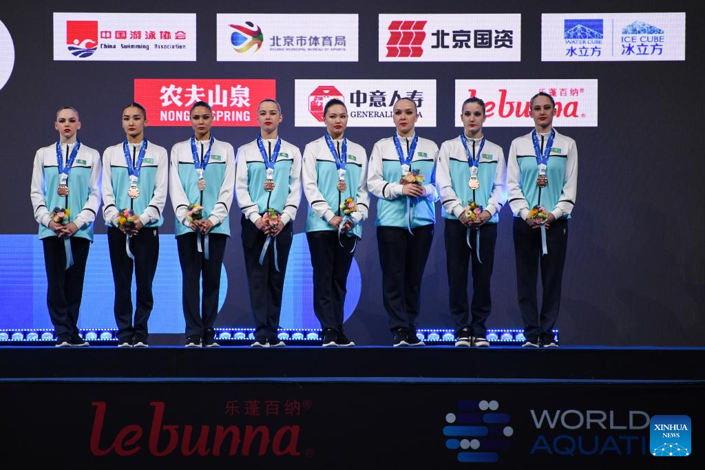 Bronze medalists team Kazakhstan pose during the awarding ceremony for the team technical event at the World Aquatics Artistic Swimming World Cup 2024 in Beijing, capital of China, April 5, 2024. (Xinhua/Ju Huanzong)