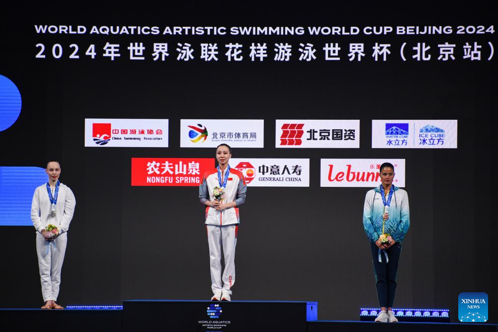 Gold medalist Xu Huiyan (C) of China, silver medalist Vasilina Khandoshka (L), registered as a neutral individual athlete, and brozne medalist Kyra Hoevertsz of Aruba pose during the awarding ceremony for the women's solo technical event at the World Aquatics Artistic Swimming World Cup 2024 in Beijing, capital of China, April 5, 2024. (Xinhua/Ju Huanzong)