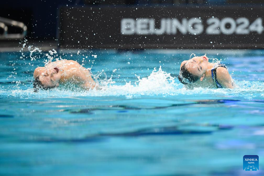 Ji Heyue(R)/Guo Muye of China compete during the mixed duet technical event at the World Aquatics Artistic Swimming World Cup 2024 in Beijing, capital of China, April 5, 2024. (Xinhua/Ju Huanzong)
