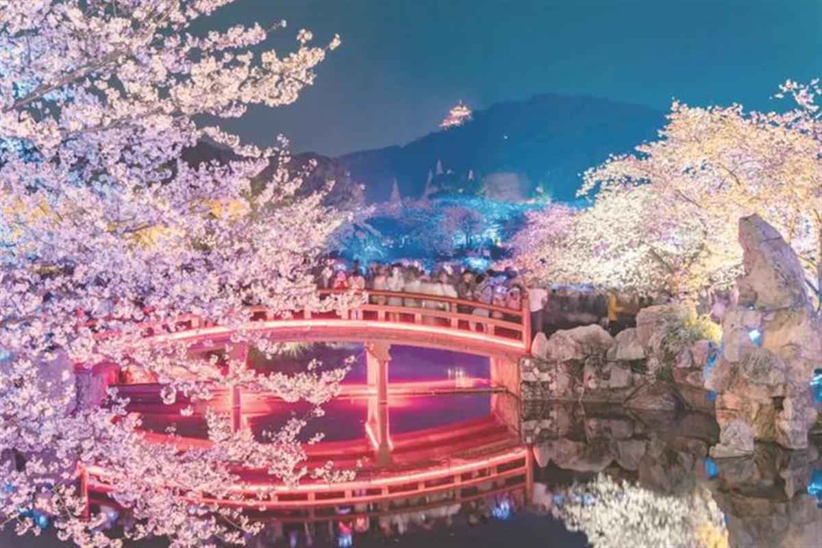 The East Lake Cherry Blossom Park underwent further enhancements in 2024, incorporating a new aerial walkway within the park. This elevated pathway offers visitors a new experience, allowing them to view the cherry blossoms from various vantage points. On the opening day of the East Lake Cherry Blossom Park, nighttime cherry blossom viewing will also be available to visitors. During the day, cherry blossom enthusiasts can stroll through the park and enjoy theatrical performances. As night falls, over 9,000 sets of lights outline the dynamic silhouette of the ancient buildings, creating an enchanting ambiance.